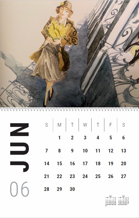 The wall calendar shows the illustration and the corresponding month on two pages, held together by a spiral binding. A small opening is provided for wall mounting. When unfolded, it is 27.9 cm wide and 43.2 cm high.